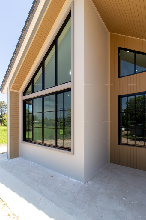 ได้เลือกใช้กระจกเป็นองค์ประกอบหลักในการดีไซน์ เป็นกระจกเฟรนวินโดว์ขนาดใหญ่ ตกแต่งลวดลายด้วยลายลูกฝัก เสริมความโดดเด่นด้วย กระจกบานฟิกซ์ เพิ่มลูกเล่นให้กับดีไซน์ภายนอก พร้อมเชื่อมต่อภายในตัวบ้านกับภายนอกได้เป็นอย่างดี เพิ่มความโปร่งโล่งให้กับบ้าน และเทควิวได้อย่างไม่ติดขัด